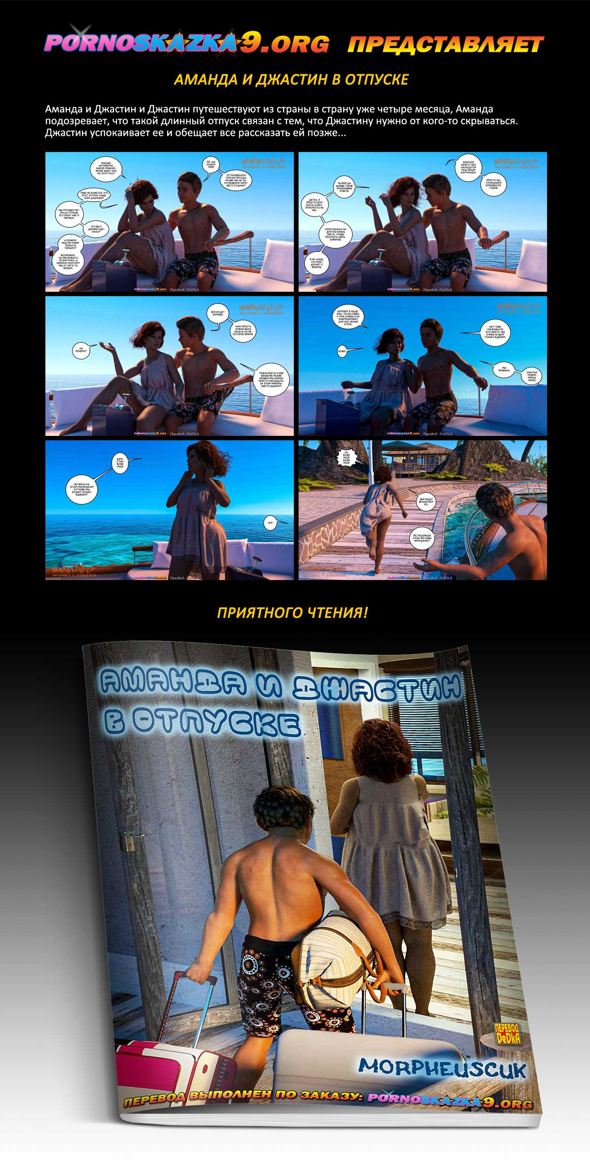 Порно комикс «Аманда и Джастин в отпуске.» Аманда и Джастин и Джастин путешествуют из страны в страну уже четыре месяца, Аманда подозревает, что такой длинный отпуск связан с тем, что Джастину нужно от кого-то скрываться. Джастин успокаивает ее и обещает все рассказать ей позже…